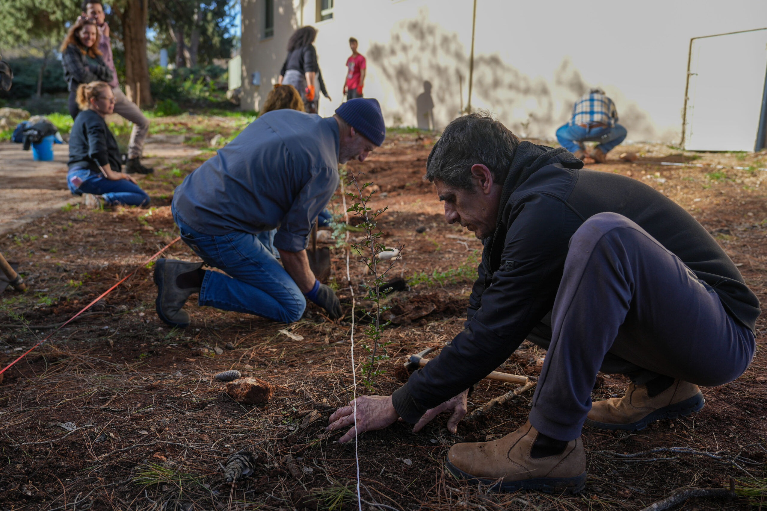 Residents of Kibbutz Malkia in northern Israel plant trees on Saturday ahead of today’s Tu B’Shvat holiday.