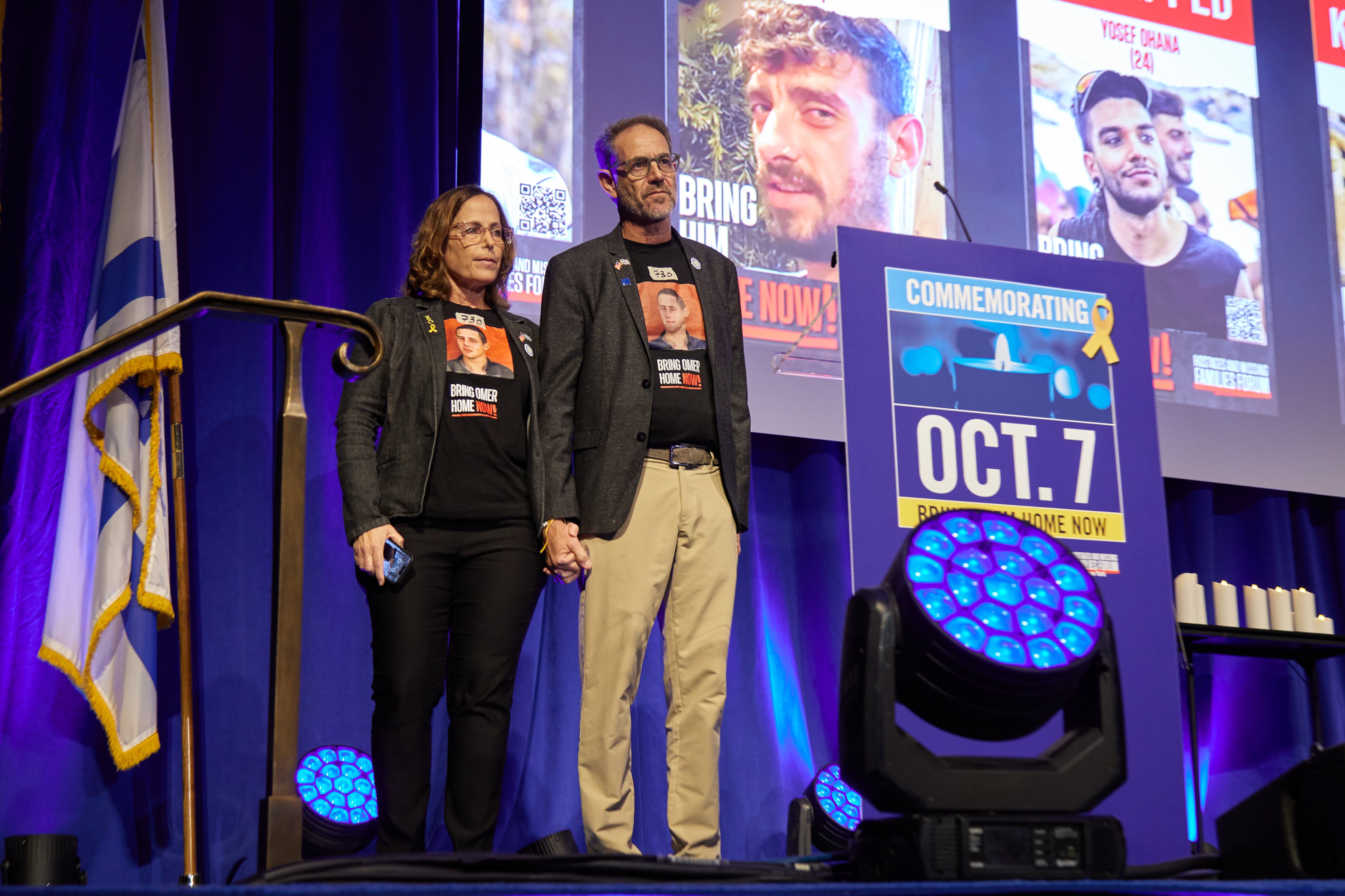 Orna and Ronen Neutra, the parents of Cpt. Omer Neutra — whose remains were taken captive on Oct. 7, 2023, and are still being held by Hamas in Gaza — speak at a memorial event yesterday marking two years since the deadly attacks at The Temple Emanu-El Streicker Cultural Center in Manhattan.