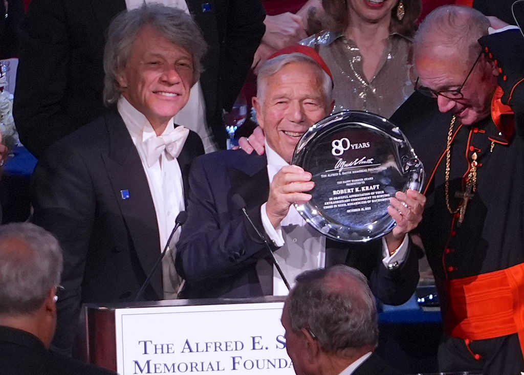 Philanthropist and New England Patriots owner Robert Kraft holds the 2025 Happy Warrior Award last Thursday, which he received at the 80th annual Al Smith Dinner in New York City.