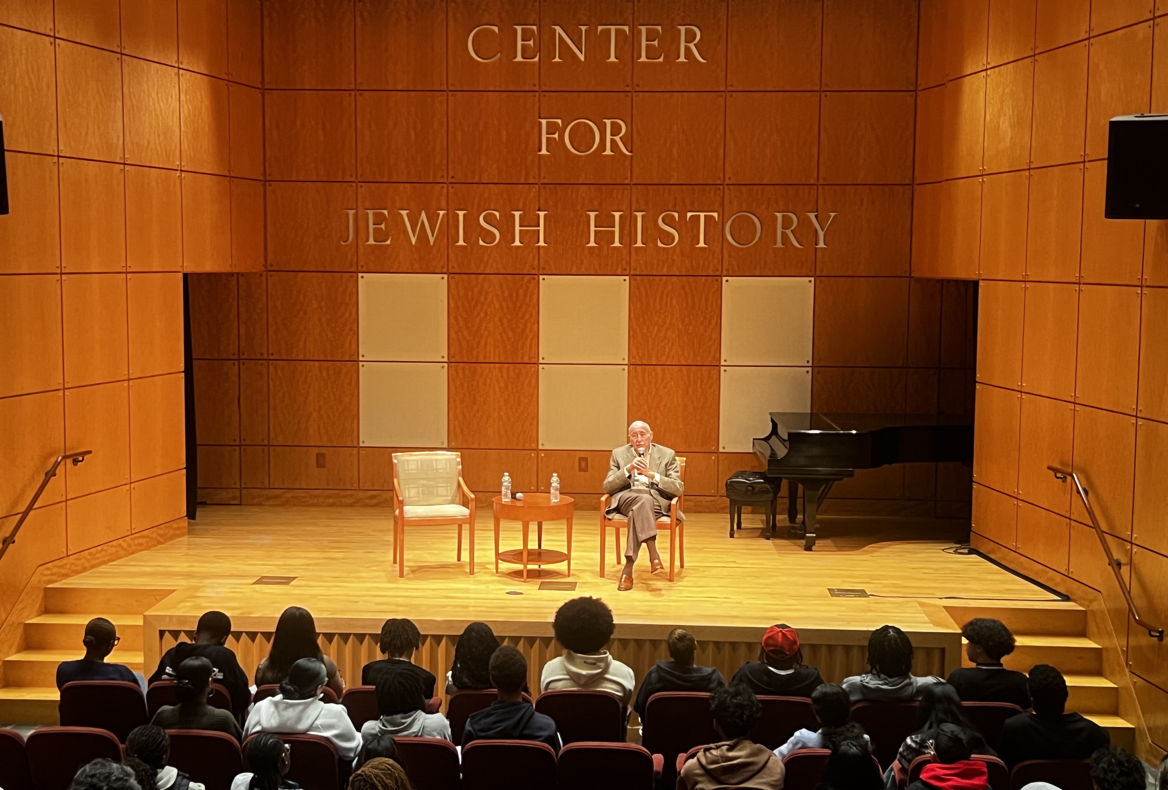 Twenty-eight New York high school students listen to Holocaust survivor Leo Ullman, who discusses his experience of surviving as a child in Amsterdam, blocks from Anne Frank’s hiding spot, at the Center for Jewish Life in New York City. The meeting was held after the students visited the museum’s Anne Frank exhibit as part of the New York City Council’s New Visions Combat Hate Fellowship, which is being run in partnership with the Auschwitz Jewish Center Foundation. |