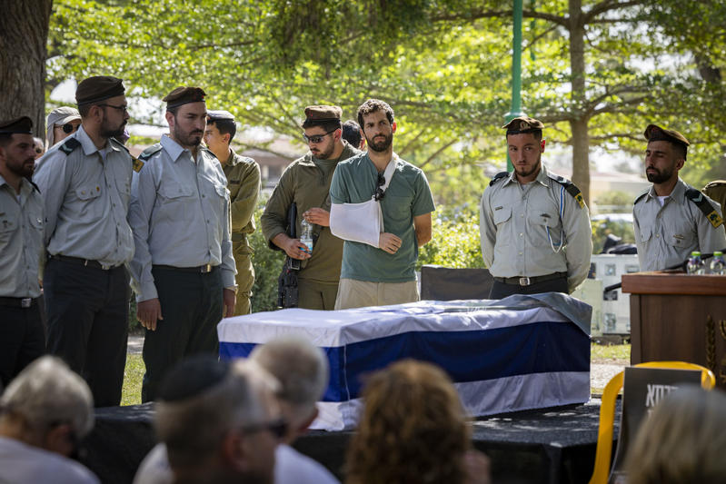 Former hostage Sagui Dekel-Chen, with his arm in a sling, attends the funeral ceremony today of slain hostage Tamir Adar at Kibbutz Nir Oz. |