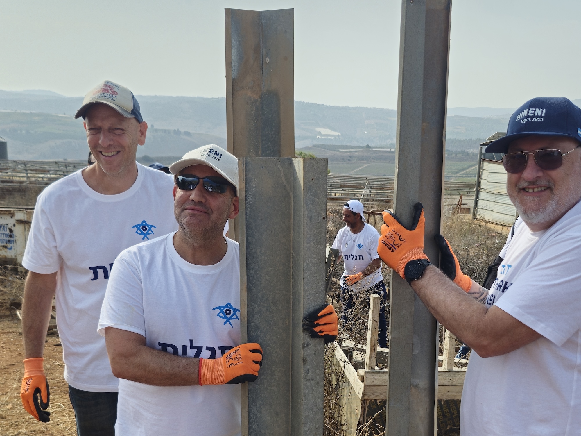 Three volunteers from Argentina hold up pieces of tin as they help rebuild homes in the northern Israeli community of Moshav Avivim last week as part of an initiative organized by the Israeli nonprofit Livnot U’Lehibanot (“To build and to be rebuilt”). They and nearly 30 other people from the South American country were visiting Israel as part of “Volunteer in Israel,” a joint initiative by Birthright Israel and the Jewish Federations of North America. |