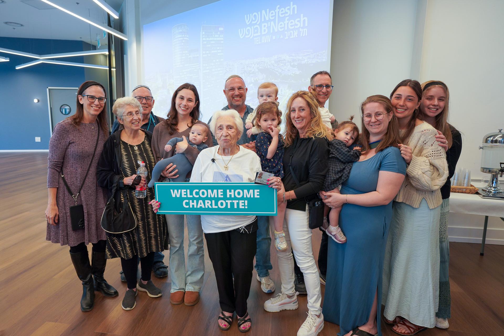 Charlotte Roth, 96, stands with some of her children, grandchildren, great-grandchildren and great-great-grandchildren earlier today after completing her aliyah process at the offices of Nefesh B’Nefesh in Jerusalem.