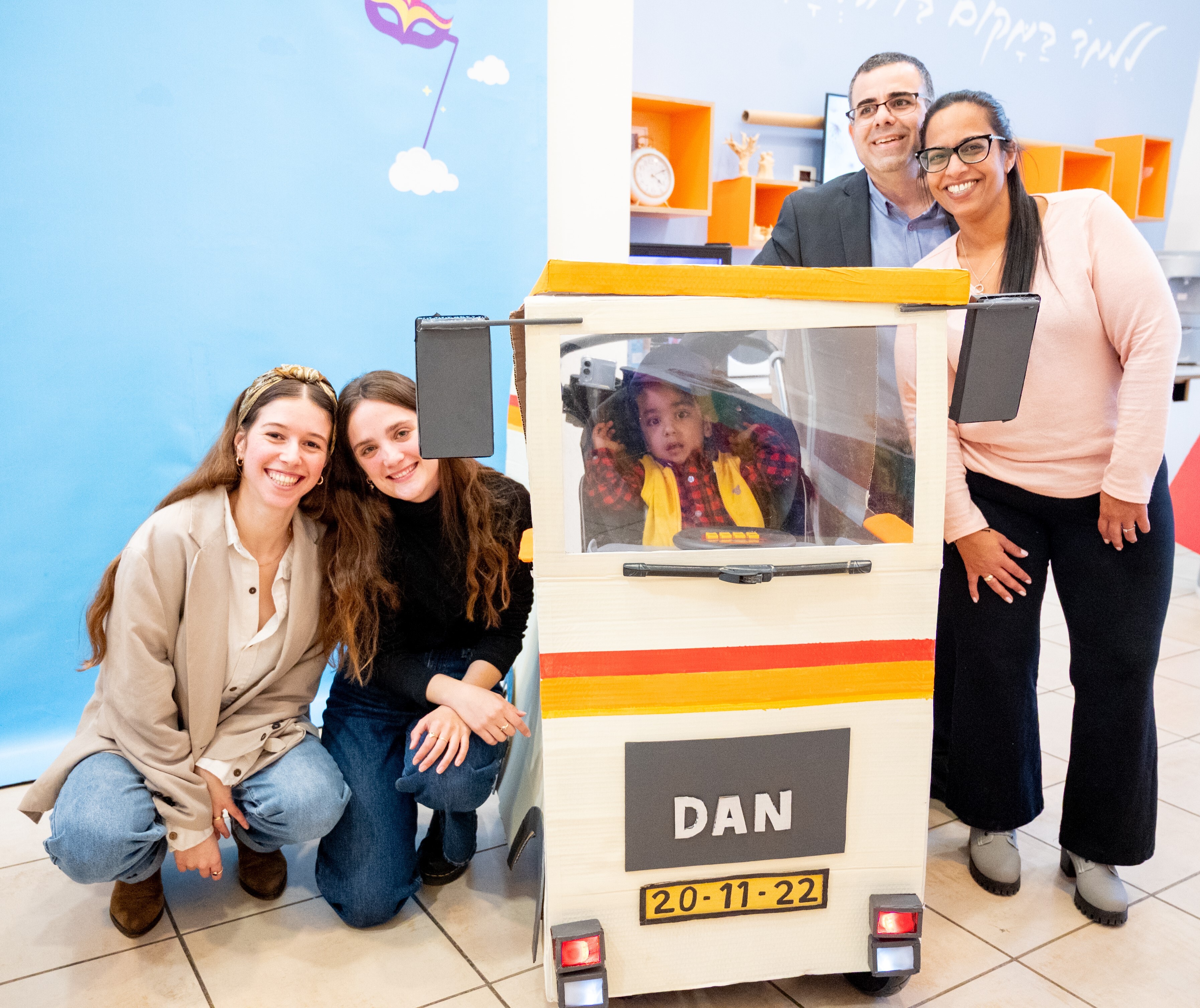 Students (left) from the Holon Institute of Technology outside Tel Aviv pose with Daniel, 3, whose wheelchair was turned into truck last week, and his parents, ahead of Purim, when people traditionally dress up in costumes. The Purim initiative, known as Dream Costumes, which was held in partnership with Beit Issie Shapiro, an Israeli nonprofit that supports people with disabilities, pairs design students with children who use wheelchairs and walkers to create customized costumes that integrate their mobility aids.