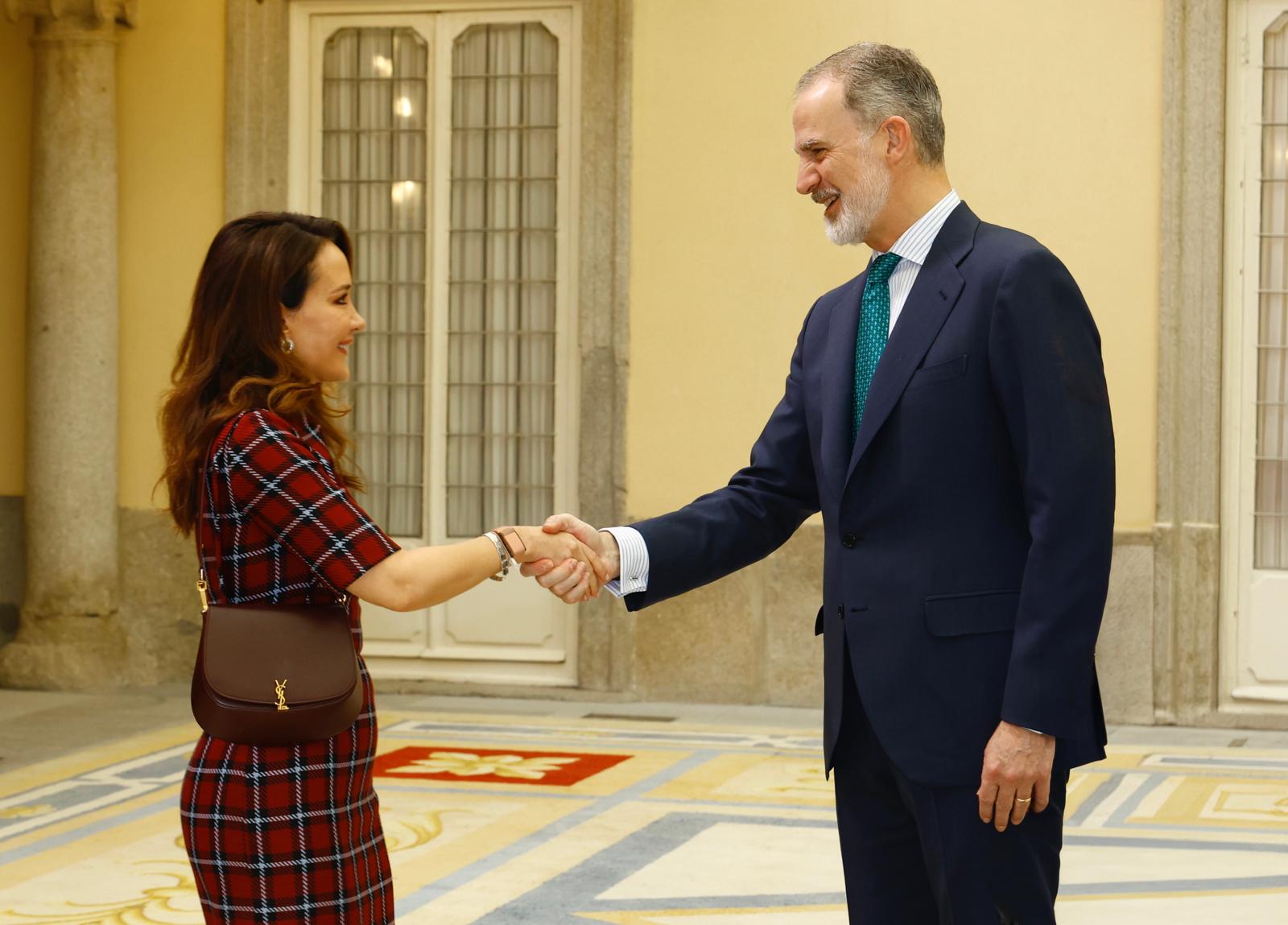 Israeli arts patron and philanthropist Batia Ofer shakes hands on Monday with King Felipe VI of Spain in Madrid after she received the Callia Foundation’s International Patronage Award, “in recognition of her outstanding commitment to the arts,” the Madrid-based foundation said.