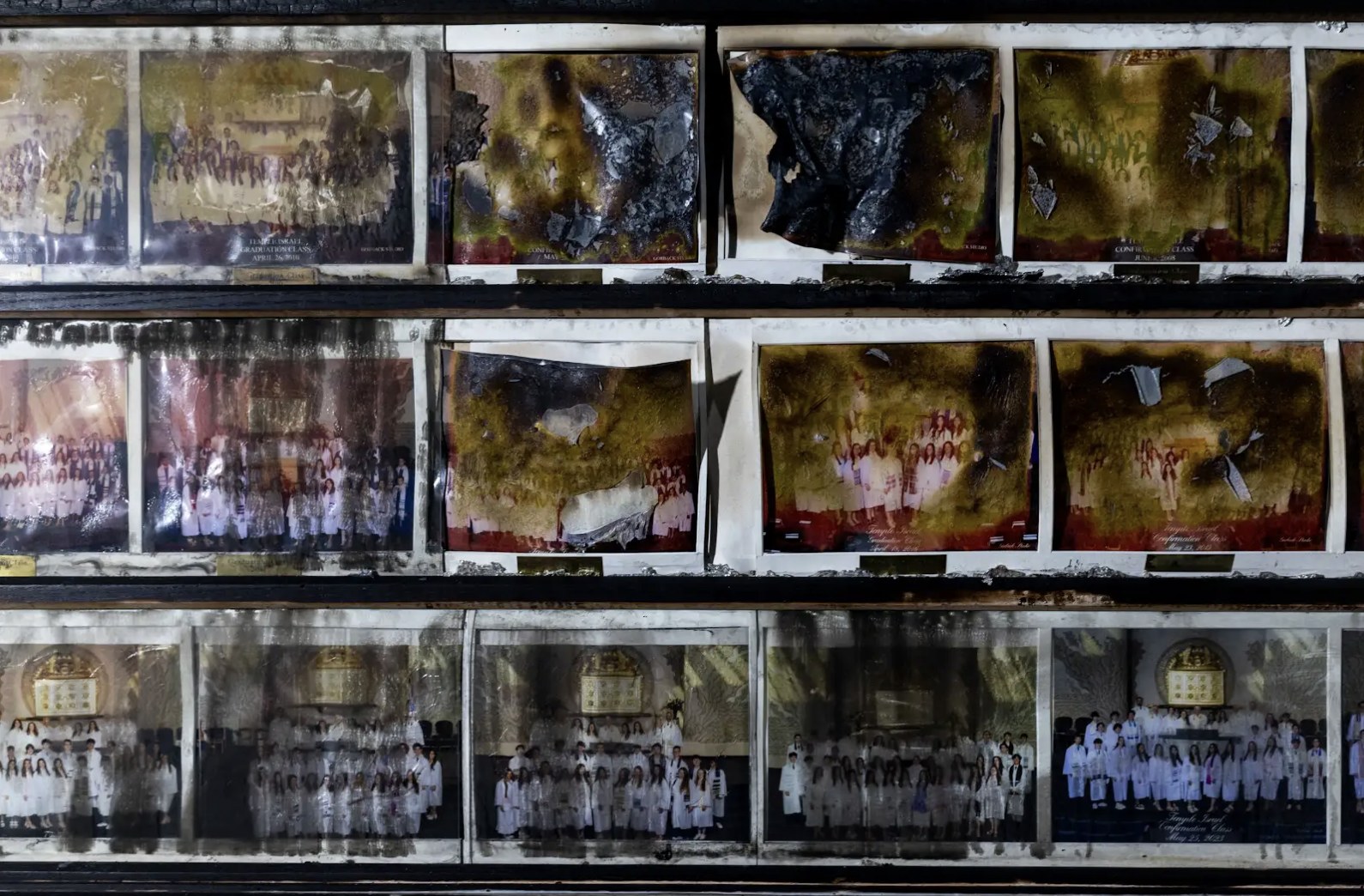 A photo display of generations confirmation classes, some of the photographs melted and charred beyond recognition, was among the images included in a Facebook post on Thursday by Temple Israel in West Bloomfield Township, Mich.
