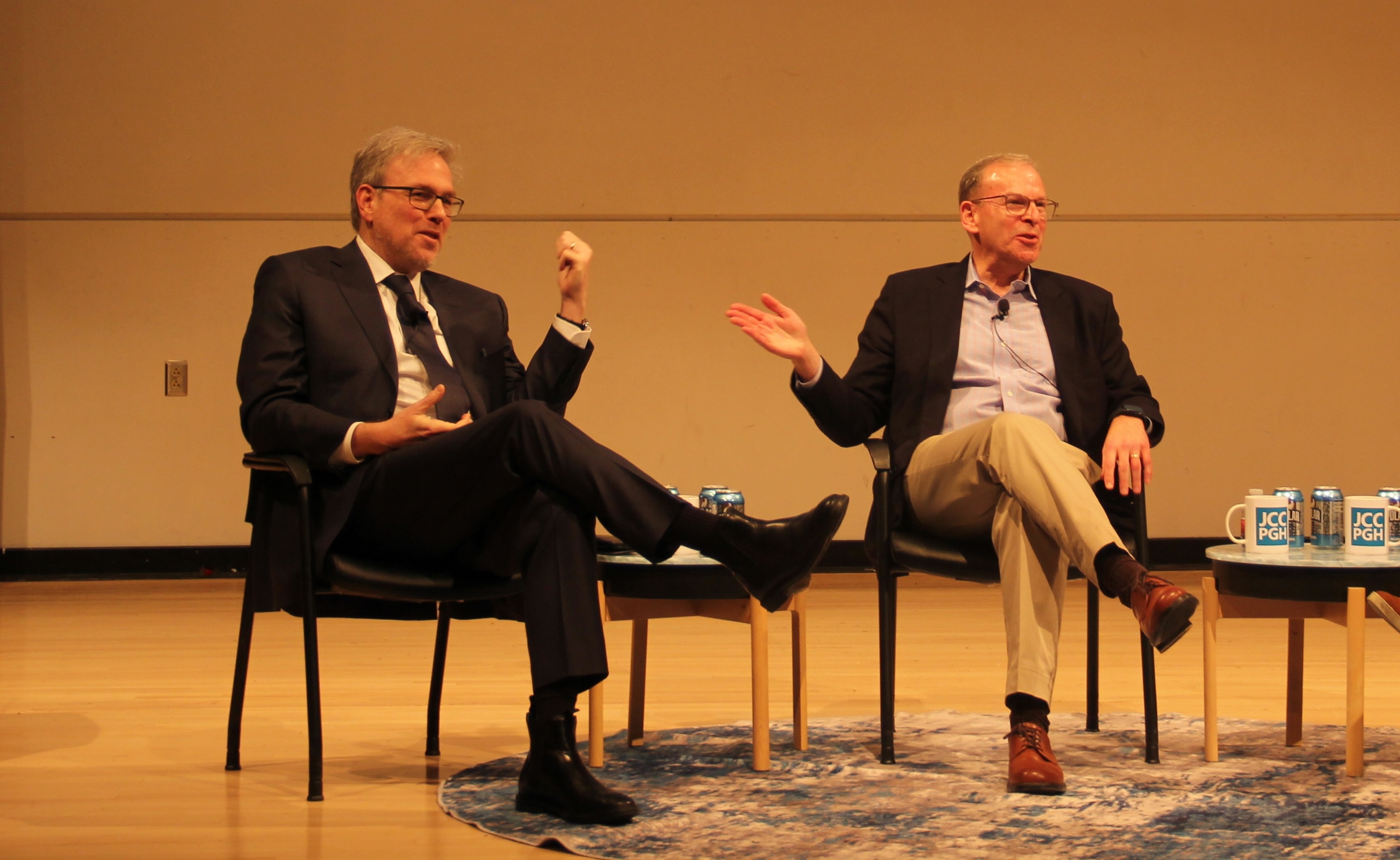 Conservative New York Times columnist Bret Stephens (left) debates Jeremy Ben-Ami, president of the progressive Israel lobbying group J Street, about Israel and the war in Iran on Wednesday at the JCC of Greater Pittsburgh.