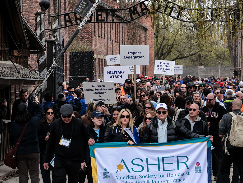 Representatives from the American Society for Holocaust Education and Remembrance and other groups march yesterday past the “Arbeit Macht Frei” gate at the Auschwitz Concentration Camp in Poland as part of the annual Yom HaShoah event. Dozens of Holocaust survivors participated in this year’s march, alongside survivors of recent antisemitic attacks. |